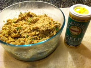 A quick word about the cornichons; I use them because they are little French pickles, and I am trying to stay as authentically French as possible. Plus, “CORNICHON” sounds fancier than pickle relish (which would work as well). Also, don’t be afraid of the kelp powder. You can find it on-line, at Wholefoods, or in a natural food market. I use it in several recipes so get a jar for future use.