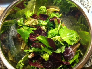 Assemble your salad in this fashion: baby greens on the bottom, a scoop of tuna fish in the middle, potatoes, beans, tomatoes, olives, capers, and cornichons surrounding the tuna. Then drizzle the vinaigrette over the vegetables. Dinner is complete. Bravo!! Magnifique!! Longer Letter Later.
